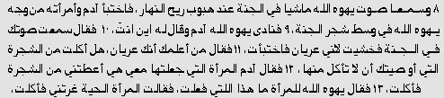 Plus tard, ils entendirent la voix de Yahwah (heb: Yehwah) Dieu se promenant dans le jardin, vers le moment du jour où souffle la brise, et l'homme et sa femme se cachèrent de devant la face de Yahwah Dieu parmi les arbres du jardin. Et Yahwah Dieu appelait l'homme et lui disait : " Où es-tu ? " Finalement il dit : " Ta voix, je l'ai entendue dans le jardin, mais j'ai eu peur parce que j'étais nu ; je me suis donc caché. " Mais il dit : " Qui t'a révélé que tu étais nu ? As-tu mangé de l'arbre dont je t'avais ordonné de ne pas manger ? " Et l'homme dit : " La femme que tu as donnée pour être avec moi, elle m'a donné [du fruit] de l'arbre et ainsi j'ai mangé. " Yahwah Dieu dit alors à la femme : " Qu'est-ce que tu as fait ? " À quoi la femme répondit : " Le serpent - il m'a trompée et ainsi j'ai mangé". Genèse 3:8-13 |