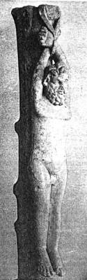 A Rome particulièrement, les martyrs étaient souvent mis sur une croix en forme de T (crux commissa ou crux summissa) comme en témoigne ce dessin de la main d’un enfant. La tête d'âne était une offense blessante à l'égard des chrétiens |