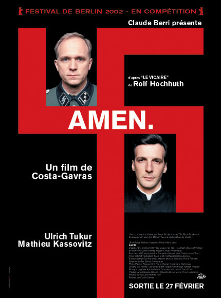 Amen de Constantin Costa-Gavras. L'affiche montre une croix chrétienne qui se prolonge en croix gammée. La Conférence des