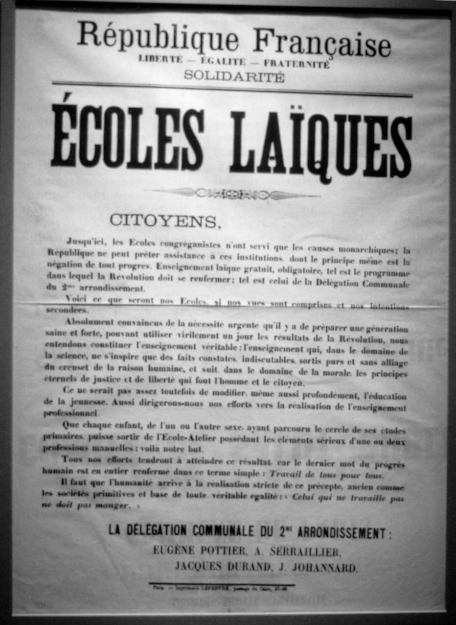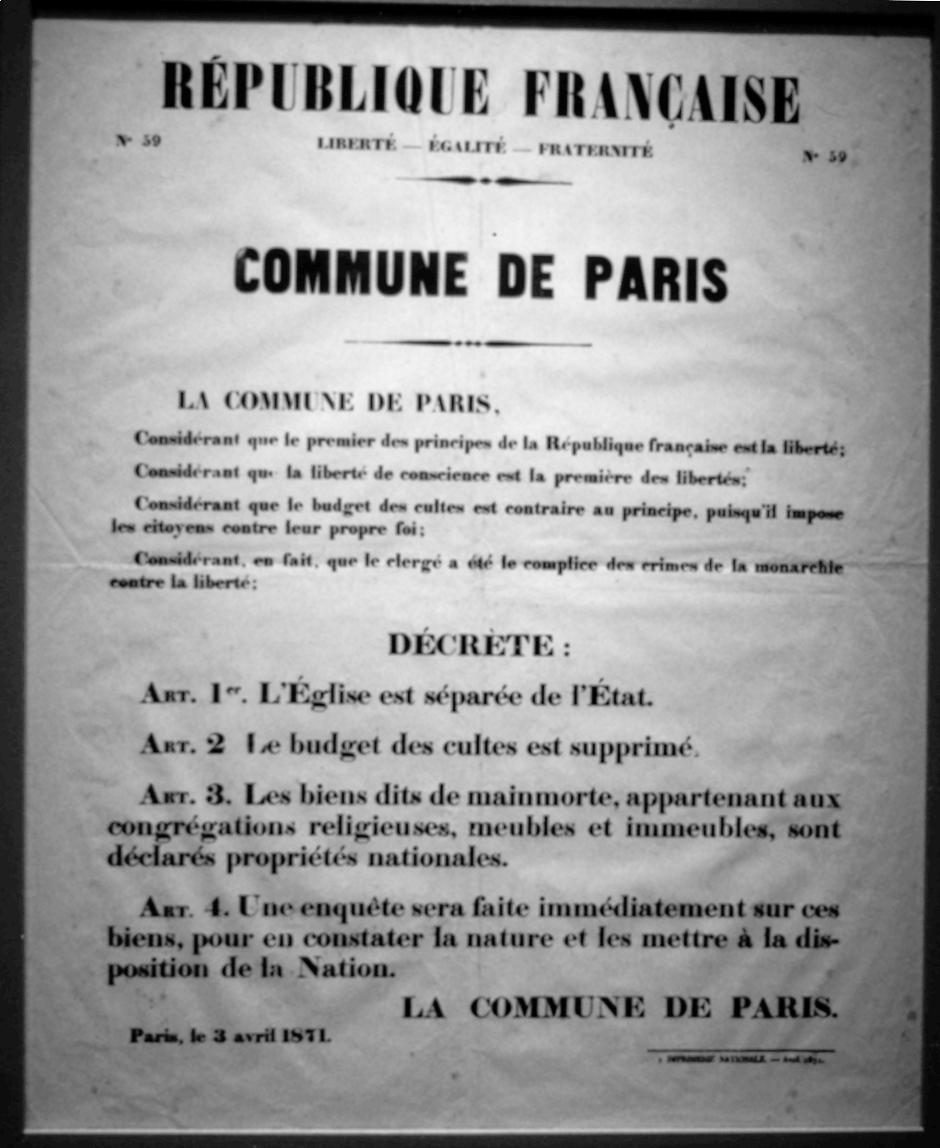 La séparation de l'Eglise et de l'Etat le 3 avril 1871 et une déclaration sur les écoles laïques par la délégation communale du 2ème arrondissement: