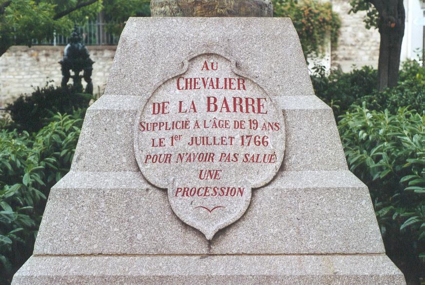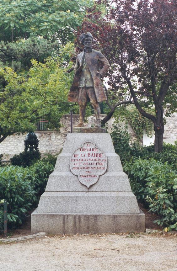 Une statue représentant le Chevalier de la Barre est de nouveau présente sur la colline de Montmartre à Paris depuis son inauguration le 24 février 2001. Elle montre François Jean de la Barre souriant, les mains dans les poches et coiffé d'un chapeau, comme un défi permanent à cette procession religieuse qu'il n'a pas salué à Abbeville en 1765. L'œuvre est cependant dépourvue de toute dimension dramatique. L'année suivante François Jean de La Barre fut décapité et brûlé pour ne pas avoir salué cette procession mais aussi pour le bris d'un crucifix. Une statue à son effigie a été érigée devant l’église du Sacré Cœur à Paris en 1905 mais elle est déplacée en 1926 dans le square Nadar proche, place moins dérangeante pour l'Eglise catholique, avant d'être fondue en 1941 sous Pétain, laissant le socle vide.