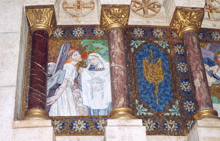 1) derrière le chœur une peinture de petites dimensions montre JC cloué sur sa croix, il admire son propre portrait imprimé par l'opération du Saint Esprit sur un linge