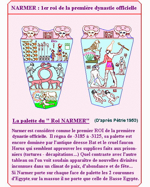 Vers -3 150 le Roi NARMER de Haute-Egypte entra en conflit avec le roi de Basse-Egypte et le vainquit. Il annexa le royaume du delta et reprit la couronne rouge de son adversaire vaincu.