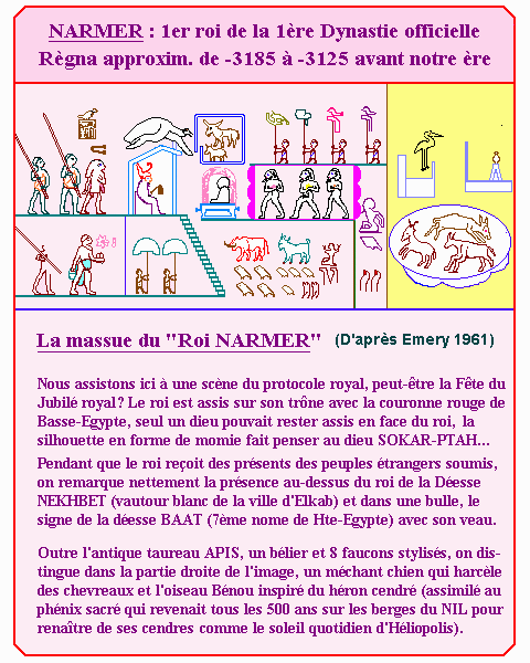 Même si le roi Narmer se présente encore comme un conquérant impitoyable et autoritaire, on décèle déjà les premiers éléments de religion primitive qui va " beaucoup évoluer " au cours des deux prochaines dynasties jusqu'à l'avènement d'Imhotep.