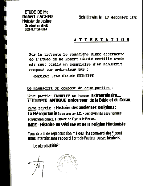 Une copie de ce manuscrit a été scellée par Maître Lacher Huissier de Justice à Schiltigheim pour servir en cas de recours légal. L'utilisation en totalité ou en partie ou en esprit des textes (chapitres ou citations partielles) restent la propriété de l'auteur, même en attendant que le projet d'édition aboutisse. Ils peuvent toutefois être repris en mentionnant le nom de l'auteur, lorsqu'ils sont transmis ou repris à des fins privées et non commerciales.Toute utilisation à des fins commerciales ou tendant à utiliser les textes à des fins rémunératrices sans l'autorisation écrite de l' auteur ou de l'éditeur mandaté restent interdites.