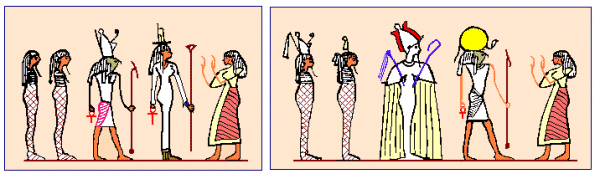 · Roi de l'Empire des morts et Régent du pays du silence, je viens à toi le cœur plein de droiture, car j'ai été trouvé sans faute grave, je n'ai pas menti sciemment et je n'ai pas commis le mal. Donne-moi des pains qui proviennent des autels des Maîtres de vérité…