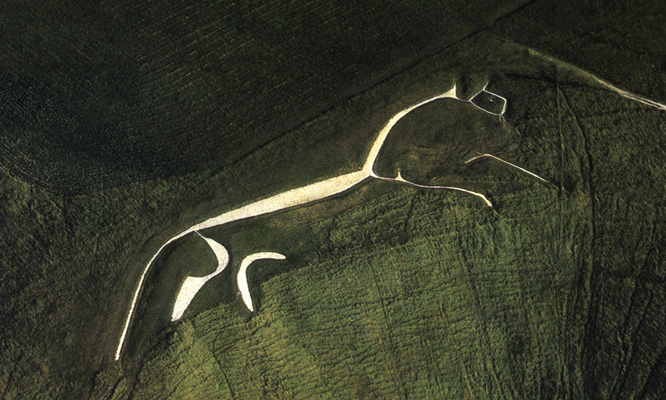 Gravée dans le calcaire d'une colline de la province de l'Oxfordshire. en contrebas des ruines du château d'Uffington, la silhouette don cheval d'une longueur de 111 m a probablement été réalisée par les Celtes de l'âge du fer. aux environs de l'an 100 av JC. La tradition locale voit dans cette représentation stylisée l'image d'un dragon, dessiné en hommage à Saint-Georges qui, selon la légende, aurait terrassé le monstre sur une colline toute proche. Mais l'hypothèse la plus vraisemblable est celle d'une gravure dédiée au culte de la déesse celte Epona. qui était généralement représentée sous les traits d'un cheval. Il existe un certain nombre de dessins de craie similaires, représentations d'hommes ou d'animaux, encore visibles en Angleterre et en Scandinavie, mais la plupart ont été définitivement effacés par la végétation.