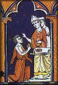 Le dimanche 7 juin, à l'aube, prélats et chanoines s'installent dans le chœur de la cathédrale. Le grand édifice est tendu de tapisseries de la couronne, le pavé recouvert de tapis de Turquie. Sur l'autel reposent les châsses de saint Remi et de saint Louis. A l'intention du Roi sont un prie-Dieu et un fauteuil dans le chœur, un trône au sommet du jubé. Vers les cinq heures et demie, l'évêque de Soissons envoie les évêques-comtes de Beauvais et de Chalons quérir Sa Majesté. Précédé par ses musiciens de blanc vêtus et par les gentilshommes au bec-de-corbin, escorté des cent-Suisses, entouré des dignitaires de la Couronne et de la Cour, le Roi, tout recueilli, est conduit jusqu'au chœur. Après le Veni Creator, prélats et chanoines vont au portail accueillir la sainte ampoule, "ce précieux trésor envoyé du ciel au grand saint Remi pour le sacre de Clovis", apportée par le prieur de Saint-Denis. Une fois l'huile sainte déposée sur l'autel, l'officiant invite le monarque à prononcer les serments du sacre. Par la promesse canonique, Louis, comme ses prédécesseurs, s'engage à conserver aux gens d'Eglise leurs libertés et immunités. C'est ensuite le solennel "serment du royaume". Le Roi le dit à haute voix, main sur l'Evangile. Il jure devant le ciel d'accorder à ses peuples paix, justice et miséricorde ; en d'autres termes, de régler les lois françaises sur les commandements de Dieu et le droit naturel. ... Les vieilles cérémonies rituelles qui suivent sont ponctuées de prières. Tour à tour le comte de Vivonne, premier gentilhomme, enlève au Roi sa robe d'argent, le duc de Joyeuse, grand chambellan, lui chausse les bottines de velours, Monsieur duc d'Anjou, lui met les éperons d'or ; puis l'officiant bénit l'épée royale, qui est censée être celle de Charlemagne. L'évêque de Soissons prend le saint chrême et pratique sept onctions, tandis que le clergé récite : "Que le Roi réprime les orgueilleux, qu'il soit un modèle pour les riches et les puissants, qu'il soit bon envers les humbles et charitable envers les pauvres, qu'il soit juste à l'égard de tous ses sujets et qu'il travaille à la paix entre les nations." Car le droit divin a pour contrepartie une longue suite de devoirs. Maintenant le grand chambellan revêt Sa Majesté de la tunique et de la dalmatique, et recouvre ses épaules d'un manteau violet semé de fleurs de lis. Le Roi reçoit alors une nouvelle onction à chaque main. Le prélat lui remet tour à tour l'anneau, le sceptre, la main de justice et la couronne de Charlemagne. Précédé des pairs du royaume, Louis monte enfin l'escalier du jubé. Installé sur son trône, à la vue du peuple, il reçoit l'hommage de chaque pair. Alors M. de Soissons dit très haut : Vivat rex in aeternum. Aussitôt les portes sont ouvertes. La foule du dehors et celle du dedans crient : "Vive le Roi !" Un étonnant tintamarre va crescendo, fait de cris spontanés, de musique militaire, de coups de canon et des arquebusades mêlées de la milice bourgeoise et des gardes françaises. Cet intermède bon enfant achevé, la cérémonie se poursuit avec un Te Deum, puis la célébration de la messe. Celle-ci terminée, le Roi descend de son trône, récite le Confiteor, reçoit l'absolution et communie sous les deux espèces. L'action de grâces de Sa Majesté achevée, l'officiant débarrasse Louis de la couronne de Charlemagne, lui en remet une plus légère, et l'accompagne jusqu'à la salle du banquet "au milieu des acclamations et des cris de joie de tous les peuples, criant : Vive le Roi". |