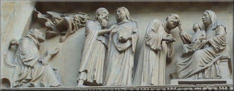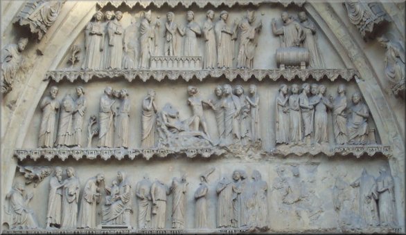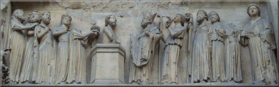 Dès son plus jeune âge, Remi se retira au convent. Mais à 22 ans, il fut choisi pour devenir archevêque de Reims. Sa renommée était telle que les murs du couvent ne purent l'étouffer. De nombreux miracles se succédèrent tout au long de sa vie. Les épisodes suivant sont représentés sur le Portail des Saints de la cathédrale de Reims : saint Remi exorcise une possédée, il chasse les démons, console les laboureurs, guérit l'aveugle de Cormicy, instruit Rogatien et sa femme puis les baptise. Enfin à Cernay, chez sa cousine Celse, il bénit un tonneau qui se remplit de vin. |