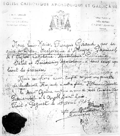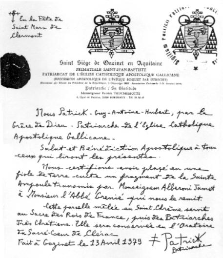 Entre autres aspects étranges et originaux dans la création du Patriarcat de Gazinet, nous relevons la cérémonie de consécration patriarcale de Mgr Giraud avec un fragment de la Sainte Ampoule.