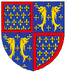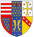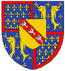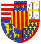 Enfin, en 1466, il peut coiffer une couronne royale, celle d'Aragon et Majorque qui lui est donnée, en tant que fils de Yolande d'Aragon, fille du roi Jean Ier († 1395), par une partie de la noblesse aragonaise révoltée contre le roi nominal, Jean II († 1479). Il place en abîme les armes d'Aragon : d'or à quatre pals de gueules. René d'Anjou, le "bon roi René", meurt à Aix-en-Provence le 10 juillet 1480. |