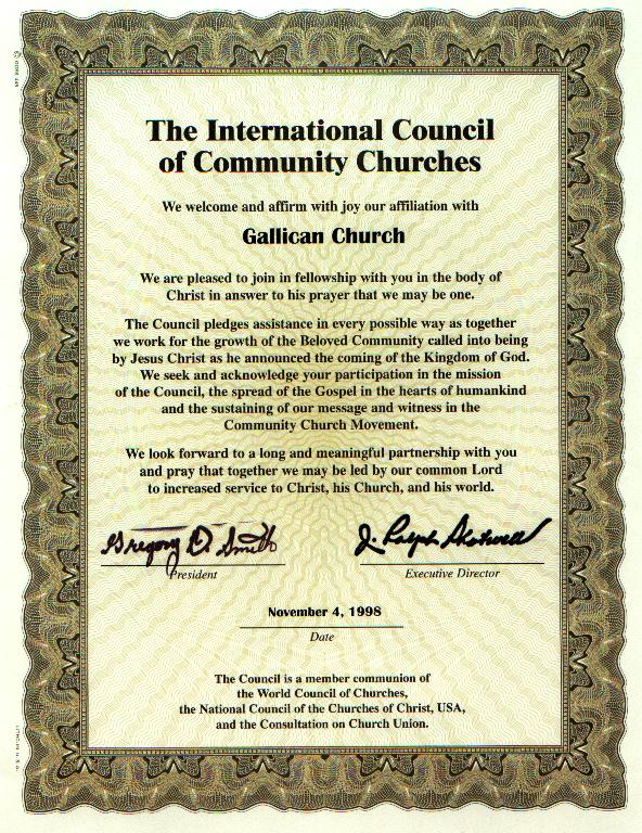 Gallicane est aussi membre du Conseil International des Eglises Communautaires
