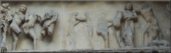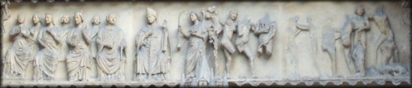 A droite, le bas-relief est devenu quasiment illisible. Il a en effet été mutilé en 1780. Sur les ruines de Sodome, onze personnages incarnent les vices. Pourquoi ce chiffre de onze alors que couramment on considère seulement sept pêchés capitaux. Plusieurs vices, en effet, peuvent s'opposer à une seule vertu. L'orgueil, la gourmandise, la colère et la luxure s'opposent à la tempérance. L'avarice est contre la justice. L'envie et la paresse sont contre la charité. Les quatre dernières vertus s'opposent à la force, la prudence, la foi et l'espérance.