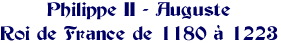 Sacré du vivant de son père, PHILIPPE AUGUSTE avait épousé en premières noces Isabelle de Hainaut qui décéda prématurément en 1190 en lui donnant en 1187 le futur Louis VIII. Après avoir s'être assuré l'amitié de Richard (Coeur de Lion) en désaccord avec son père Henry II, Philippe conquit aux anglais Issoudun, Gisors et le Maine, et alla jusqu'à exiger la destitution du roi anglais en faveur de son fils-rebelle : Richard Coeur de Lion.
