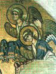 La période macédonienne (867-1057) après deux siècles de destructions et de décadences, donne des églises sous influences russe et grecque (construction selon la croix grecque, dans un carré, déjà utilisée à Sainte-Sophie) comme l'église de Daphni, en Grèce, qui cpossède de belles mosaïques.![]() |