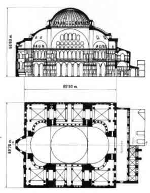 La première église construite sous Justinien avec une coupole est celle de Saints-Serge-et-Bacchus à Constantinople. L'église de Sainte-Irène, à Constantinople aussi, comporte deux coupoles de même diamètre, mais de hauteurs différentes.