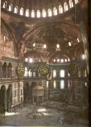 Après la prise de Constantinople par les Turcs en 1453, la basilique a été transformée en mosquée : ajout de minarets aux quatre coins, mosaïques recouvertes d'un badigeon ou dissimulées derrière de gros panneaux ronds portant les noms de Allah, de Mahomet et des quatre premiers califes.