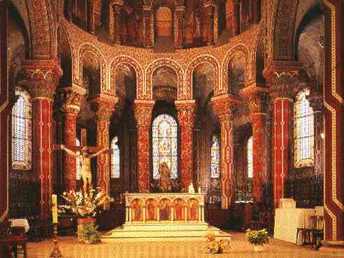 Ce qui frappe à l'intérieur de l'église d'Issoire, c'est la couleur rouge dominante de ses colonnes et de ses chapiteaux, ainsi que le Christ en médaillon dans la coupole. |