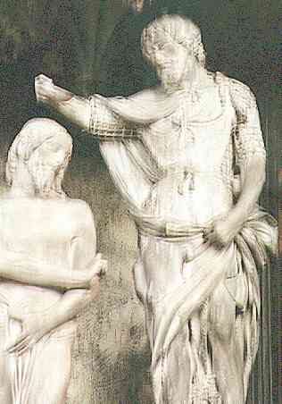 Jean-Baptiste est arrêté pour avoir reproché au roi Hérode d'épouser la femme de son frère. Et il est décapité à la demande de la fille du roi, sur le conseil de sa mère.