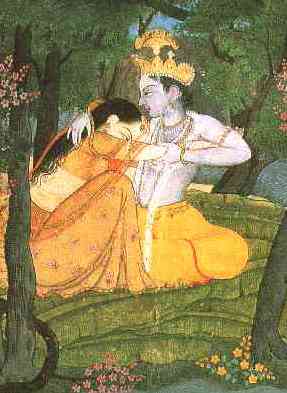 La relation d'amour entre le Dieu et ses fidèles est dépeinte dans de nombreux récits populaires (Bhagavata Purana, 9ème siècle) sous la forme de rencontres entre Krishna et les gopis (épouses), en particulier Radha.