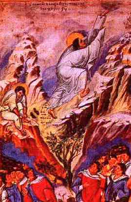 Au Sinaï, Moïse reçoit les dix commandements et engage Israël à suivre la Loi de l’Alliance, qui préconise la crainte et l’amour d’un Dieu unique invisible, omniscient et tout-puissant.Les dix commandements :