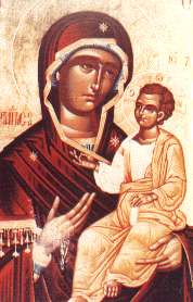Icône dite "Marie porte du ciel". Une des plus anciennes du Mont Athos. Beaucoup de représentations de cette icône suintent de l’huile parfumée sur la main de Jésus, pouce et annulaire joints, et sur les mains de Marie. |