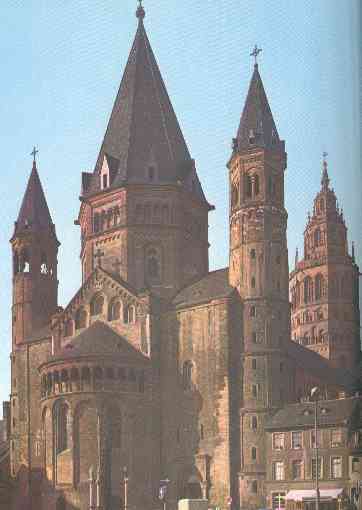 La cathédrale de Mayence en est un bel exemple; commencée en 975, incendiée le jour même de sa consécration en 1009, la reconstruction a duré près d'un siècle mais a conservé le style initial. Saint-Pantaléon de Cologne (commencée en 984), Saint-Michel d’Hildesheim (commencée en 1001), Spire (commencée en 1030) sont d'autres exemples connus. Worms, du 12ème siècle, en reprend le style beaucoup plus tard.