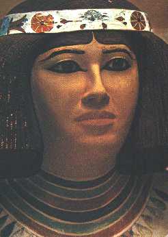 | Nofrit, statue de la princesse égyptienne datant de 4600 ans, placée dans sa tombe, et découverte récemment en même temps que celle-ci; on peut noter l'extraordinaire expression du regard. |