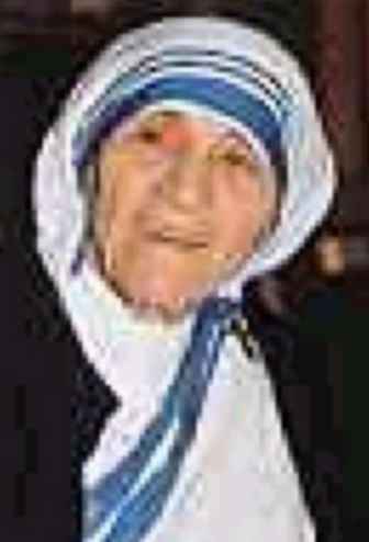 Mère Teresa (Agnes Gonxha Bajaxhiu, 1910-1997 Calcutta), était une religieuse catholique d'origine albanaise. Entrée à 18 ans dans un couvent en Irlande, elle a prononcé les voeux solennels en 1937. D'abord directrice d'un collège catholique à Calcutta, elle s'est consacrée en 1948 aux pauvres, aux malades et aux mourants des rues de la ville.Dès 1950, Mère Teresa (avec ses assistantes) a fondé la Congrégation des missionnaires de la Charité, reconnue par le diocèse de Calcutta puis approuvée comme congrégation pontificale sous la juridiction de Rome (4 voeux pour cette communauté : pauvreté, obéissance, chasteté, au service des plus démunis). |