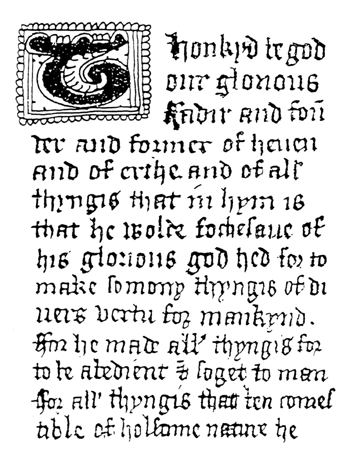 Grâces soient rendues à Dieu notre glorieux géniteur, auteur et créateur du ciel et de la terre et de toute chose qui s'y trouve de ce qu'il ait voulu engager sa glorieuse divinité dans la création de tant de choses diversement utiles à l'humanité. Car il fit toutes choses pour qu'elles fussent obéissantes et soumises à l'homme. Car tout ce qui est comestible, de nature saine, Il le créa pour la subsistance de l'homme.