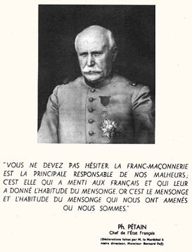 "Pour le Maréchal, un Juif n'est jamais responsable de ses origines, un Franc-Maçon l'est toujours de son choix." Adrien Marquet