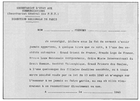 sommes." En juin 1940, le gouvernement de Vichy s'installe. Le 19 août de la même année, le "journal officiel" publie le décret de dissolution du Grand Orient de France et de la Grande Loge de France. Les autres obédiences seront dissoutes le 27 février 1941. Certains mandats politiques ne seront plus accessibles aux Francs-Maçons. Cependant, la Franc-Maçonnerie continuera d'exister dans la clandestinité.