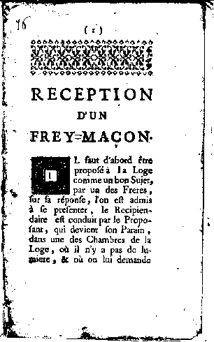 Il faut d'abord être proposé à la Loge comme un bon Sujet, par un des Frères, sur sa réponse, l'on est admis à se présenter, le récipiendaire est conduit par le Proposant, qui devient son Parain, dans une des Chambres de la Loge, où il n'y a pas de lumière, & où on lui demande