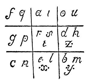 Ce merveilleux alphabet consiste en deux lignes paralleles perpendiculaires, coupées de deux lignes horisontales aussi paralleles, ce qui forme au milieu un quarré régulier, quatre quarrés ouverts, & quatre angles égaux. Toutes ces divisions forment neuf cases, tant ouvertes que fermées, dont cinq contiennent chacune deux lettres & les quatre autres trois.