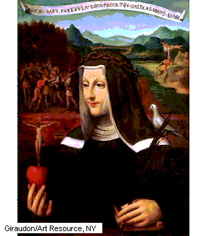 Tertiaire dominicaine, mystique, et docteur de l'Église, qui joua un rôle significatif au plus haut niveau de la vie de l'Église de son époque. Caterina Benincasa naquit à Sienne le 25 mars 1347. À seize ans elle entra dans le tiers ordre de saint Dominique à Sienne, c'est-à-dire qu'elle restait laïque, mais était liée à l'ordre dominicain. Pour elle, la vie chrétienne et la sainteté ne demandaient pas de s'isoler du monde, mais plutôt de garder, où que l'on vive, une âme ardente, unie à l'amour de Dieu pour le monde. Elle fut vite remarquée pour son ascendant spirituel, son dévouement aux pauvres et sa gaieté. Elle dicta des lettres (382 lettres en italien) qui lui attirèrent l'admiration, et surtout exprima sa pensée dans son Dialogue de la divine providence, traité de l'amour de Dieu qui décrit l'itinéraire de l'âme vers l'union avec la Trinité La mystique de sainte Catherine fut tournée vers l'Église. Son principal souci était celui de sa réforme. La papauté était installée en Avignon depuis plus de soixante ans. En 1376, elle se rendit à Avignon pour convaincre le Pape de rentrer à Rome et de commencer à réformer l'Église. Grégoire XI accepta, mais mourut en arrivant à Rome en 1378. C'est alors qu'éclata le Grand Schisme d'Occident, avec deux papes élus, l'un à Avignon, l'autre à Rome. Catherine conseilla Urbain VI, qu'elle reconnaissait comme légitime. Elle mourut épuisée le 29 avril 1380, à trente-trois ans. Son corps fut enterré dans l'église Sainte-Marie sopra Minerva. Son œuvre lui valut d'être la deuxième femme proclamée docteur de l'Église, après sainte Thérèse d'Avila, en 1970. Dans l'Église catholique, sa fête est le 29 avril. |