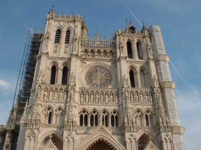 Le gros œuvre est achevé en 1290, en seulement 70 ans ! Longue de 145 mètres et haute de 42,30 mètres sous voûte, la cathédrale témoigne de la puissance des évêques d'Amiens et de la richesse économique de la ville. Sa surface couvre 7700m2 et permettait à toute la population, soit environ 10000 habitants d'assister à la même cérémonie. C'était la véritable maison du peuple de l'époque. Abîmée par la foudre en 1528 puis par les ouragans aux XVIIe et XVIIIe siècles, elle sera meurtrie, de la main de l'homme, par les bombardements de 1940.
