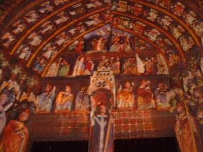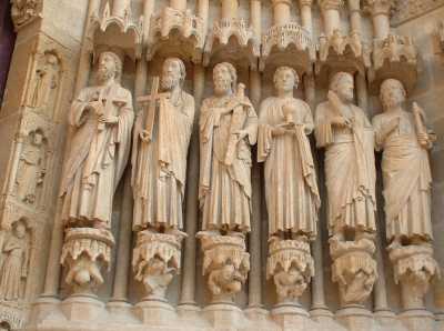 Sa façade nous révèle toute la richesse de l'iconographie médiévale : véritable bible de pierre. La sculpture n'est pas uniquement un décor mais constitue souvent l'essence même du monument. Elle est son message et servait, à une époque où peu de personnes savaient lire, de support pour le catéchisme. Une réalité aujourd'hui bien terne face à l'art des imagiers du Moyen-âge. A Amiens, un spectacle son et lumière permet de nous restituer la richesse de la polychromie de ces statues ; des couleurs aujourd'hui disparues.