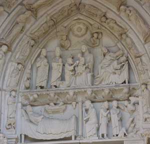 Au linteau est représentée la Nativité, suivie de l'Annonce aux