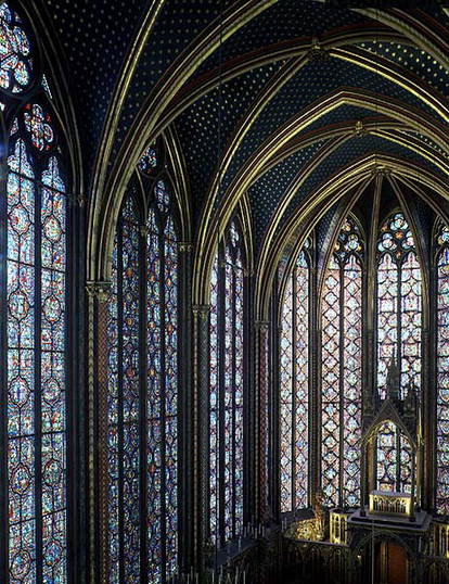La Sainte Chapelle à ParisIntérieur de la chapelle haute dédiée à la Sainte Couronne d’Épines et à la Vraie Croix : vaisseau de quatre travées et chevet à sept pans. |