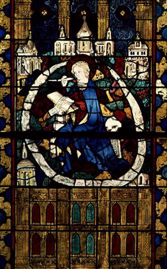 Saint Jean l’Évangéliste écrivant l’Apocalypse, vitrail, XIVe siècle. Cathédrale Saint-Pierre de Beauvais, France