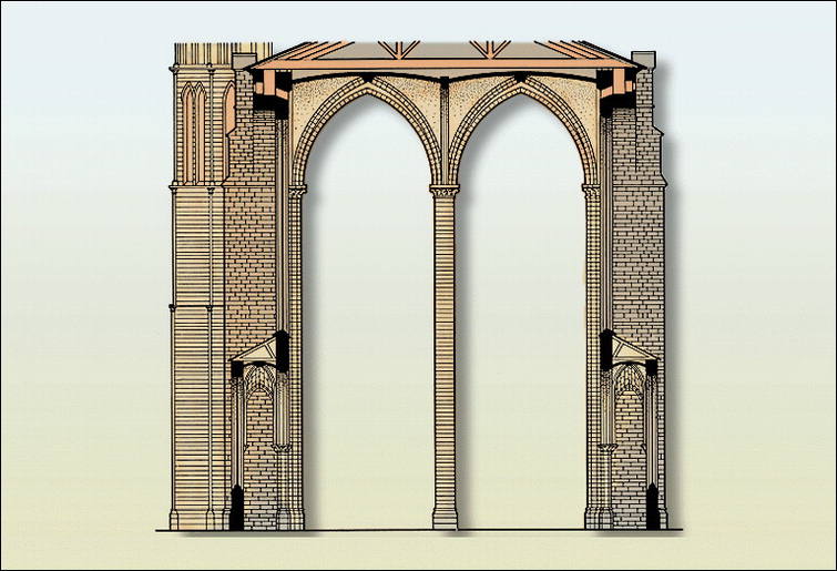 Coupe transversale de l’église des Jacobins de Toulouse, XIIIe-XIVe siècle (d’après M. Aubert, « Le Gothique à son apogée », Paris, 1964).