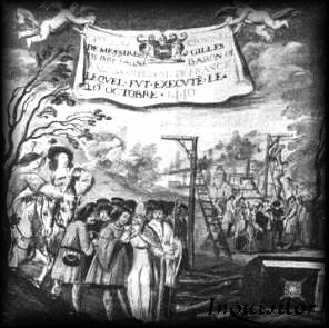 Gilles demandera d’être brûlé avant ses serviteurs Poitou et Henriet eux aussi condamnés à mort, on lui accordera cette grâce.Le 26 Octobre 1440, gilles est pendu et ensuite livré aux flammes, on retirera son corps ensuite pour qu’il soit enterré par quatre ou cinq dames de grand état.