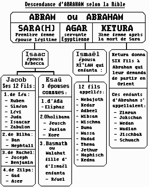 Sarah mourut à l'âge de 125 ans, Abraham devenu veuf, prit alors pour femme KETURA qui lui donna encore six enfants que la Bible nomme : Zimran, Jokschan, Medan, Madian, Jischbak et Schuach.