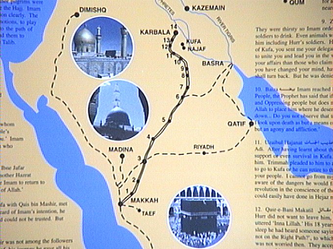 La carte nous montre le parcours que Imàm Houssein a pris quand il a quitté Makkà pour se diriger vers l'Iraq. C'était le 8 Zilhajj 60 Hijri (10/9/680). Il y avait avec lui environs 50 personnes incluant femmes, enfants et amis.