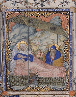 Nativité. Nativité. Nativité. (BNF, LAT 18014) fol. 38 Petites Heures de Jean de Berry France, Paris XIVe s. (90 x 70 mm) Précédent. Suivant. Petites Heures de Jean de Berry Page d'accueil.