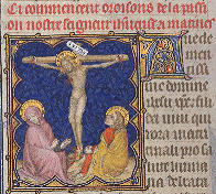 Christ en croix. Christ en croix. Christ en croix, pleuré par la Vierge et par saint Jean. (BNF, LAT 18014) fol. 63v Petites Heures de Jean de Berry France, Paris XIVe s. (55 x 45 mm) Précédent. Suivant. Petites Heures de Jean de Berry Page d'accueil.