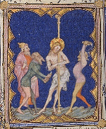 Flagellation du Christ. Flagellation du Christ. Flagellation du Christ. (BNF, LAT 18014) fol. 83v Petites Heures de Jean de Berry France, Paris XIVe s. (90 x 70 mm) Précédent. Suivant. Petites Heures de Jean de Berry Page d'accueil.