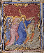 Portement de Croix. Portement de Croix. Portement de Croix. (BNF, LAT 18014) fol. 86v Petites Heures de Jean de Berry France, Paris XIVe s. (90 x 70 mm) Précédent. Suivant. Petites Heures de Jean de Berry Page d'accueil.