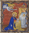 Annonce de la mort de la Vierge. Annonce de la mort de la Vierge. L'ange annonce à la Vierge sa mort prochaine. (BNF, LAT 18014) fol. 143v Petites Heures de Jean de Berry France, Paris XIVe s. (55 x 45 mm) Précédent. Suivant. Petites Heures de Jean de Berry Page d'accueil.