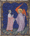 Jean de Berry conduit par un ange. Jean de Berry conduit par un ange. Jean de Berry conduit par un ange. (BNF, LAT 18014) fol. 199v Petites Heures de Jean de Berry France, Paris XIVe s. (55 x 45 mm) Précédent. Suivant. Petites Heures de Jean de Berry Page d'accueil.
